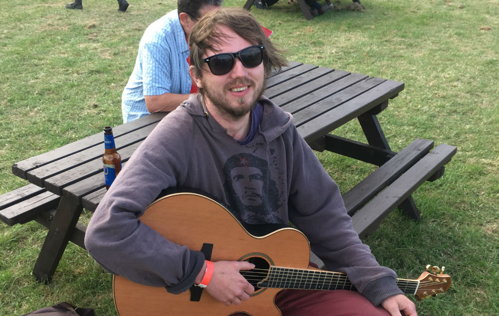 By the way, what was he strumming along the guitar when I came along? “’John Wesley Harding’ by Bob Dylan,” he explains, removing his shades, “but I changed the words to ‘Jeremy Corbyn’.”
