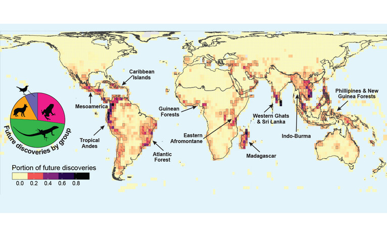 Moura and Jetz show that the chances of new species discovery varies widely across the globe. Their analysis suggests Brazil, Indonesia, Madagascar, and Colombia hold the greatest opportunities for identifying new species overall, with a quarter of all potential discoveries. Unidentified species of amphibians and reptiles are most likely to turn up in neotropical regions and Indo-Malayan forests.