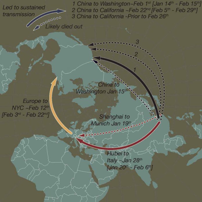 Instead, the new study implicates a direct-from-China source of the U.S. outbreak, right around the time the U.S. administration implemented a travel ban for travelers from China in early February. The nationality of the “index case” of the U.S. outbreak cannot be known for certain because tens of thousands of U.S. citizens and visa holders traveled from China to the U.S. even after the ban took effect.