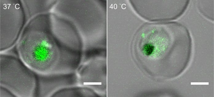 To mimic malarial fever in the lab, the researchers placed malaria-infected red blood cells in an incubator heated to 104 degrees Fahrenheit for six hours before bringing them back down to normal body temperature, 98.6 degrees.