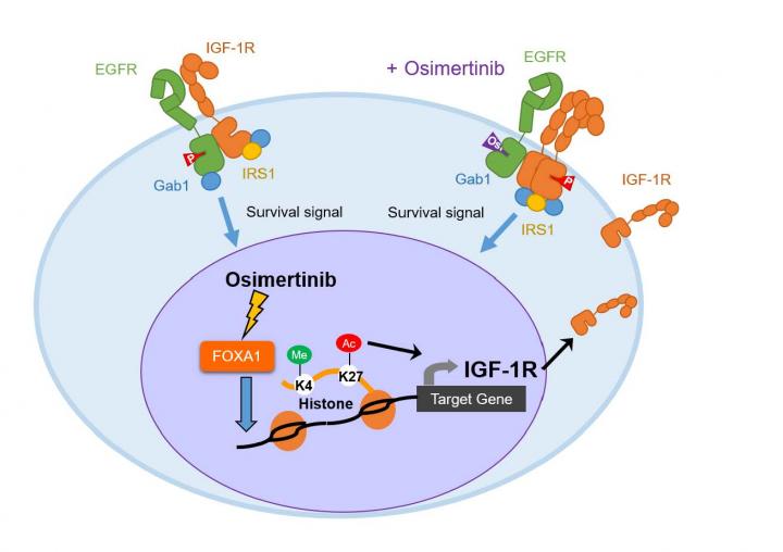 Through experiments aiming to understand the mechanism behind osimertinib tolerance, Yano and colleagues discovered that phosphorylation of IGF-1R was increased in AXL-low-expressing tumor cell lines, but not in AXL-high expressing tumors. (IGF-1R stands for ‘insulin-like growth factor 1 receptor’; it is a protein located on the surface of human cells. Phosphorylation is the chemical process of adding a phosphoryl group.) The researchers then found that phosphorylated IGF-1R supported the survival of AXL-low expressing tumors after exposure to osimertinib.