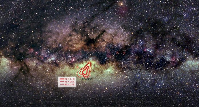 The position of the feature — known to scientists as the “Tilted Disk” because it looks tilted compared with the rest of the Milky Way — couldn’t be explained by known physical phenomena such as galactic rotation. The team had a rare opportunity to study the protruding Tilted Disk, liberated from its usual patchy dust cover, by using optical light. Usually, the Tilted Disk must be studied with infrared or radio light techniques, which allow researchers to make observations through the dust, but limit their ability to learn more about ionized gas.