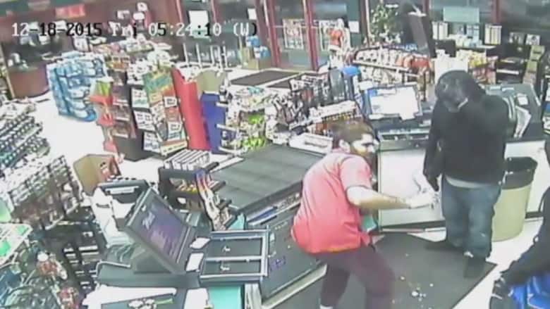 Karanpal Bhangu reacting on surveillance video during robbery at Mac’s Convenience store in December, 2015. (Court exhibit )