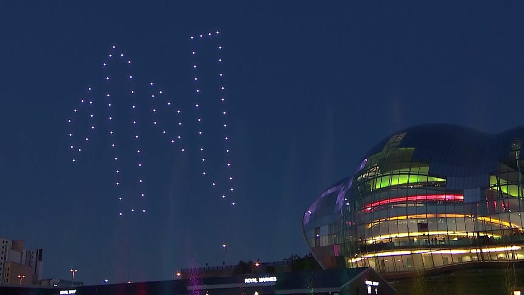 A hundred drones fitted with LED lights were piloted in formation between the Sage music centre and the Baltic art gallery, choreographed to form different 3D shapes.