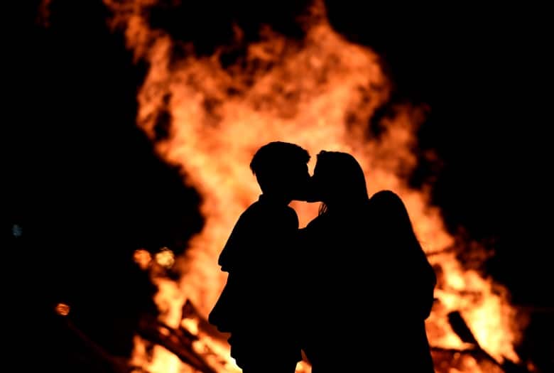 A couple kiss next to of the bonfire on the Poniente Beach celebrating the summer solstice in Gijon, Spain, on June 24, 2017. (Eloy Alonso/Reuters)