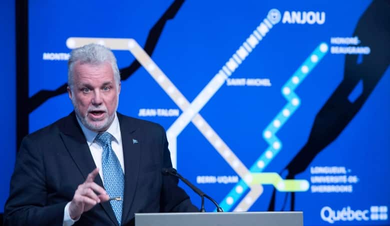 Quebec Premier Philippe Couillard delivers a speech during the announcement of the extension of one of Montreal’s subway line Monday, April 9, 2018 in Montreal. (Paul Chiasson/Canadian Press)
