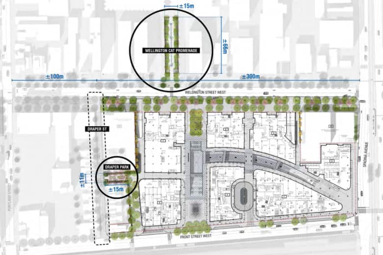 The map outlines The Well development, as well as circling the two cat-themed parks planned for the neighbourhood. The Wellington ‘Cat Promenade’ will take the place of popular nightclub, The Addisons Residence. (City of Toronto)
