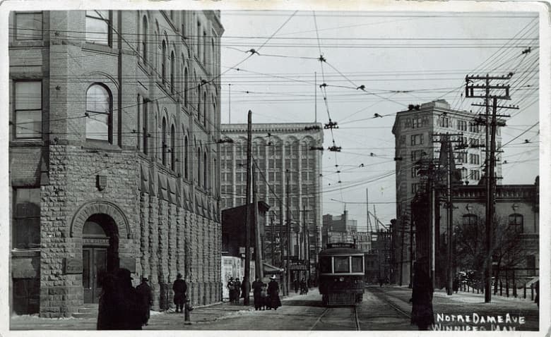 This view looking north on Notre Dame Avenue shows the Lindsay Buildng in the background, which is where the old rails were discovered. (Submitted by Steven Stothers)
