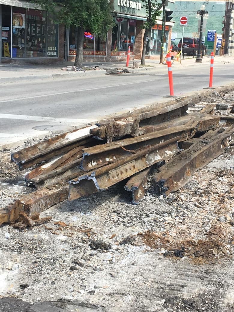 Construction crews dug up these streetcar rails at the intersection of Ellice Avenue and Garry Street. (Submitted by Steven Stothers)