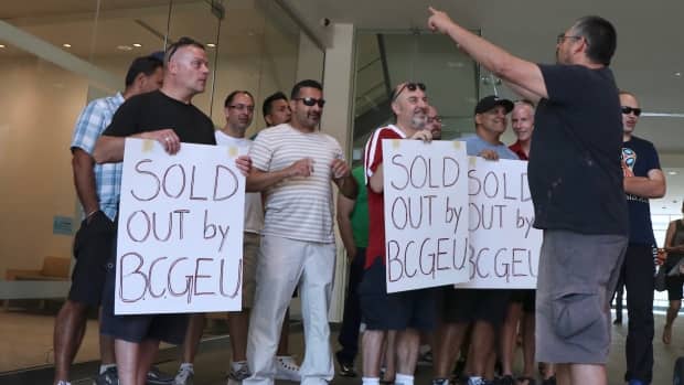 Upset members of the BCGEU were granted an unscheduled meeting with a union representative to discuss what they call an unfair tentative agreement. (Rafferty Baker/CBC)