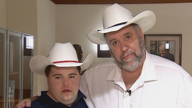 Mark Cronin and his son John receive white hats from Mayor Nenshi in a ceremony on June 19, 2018 (Mike Symington/CBC News)