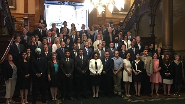 Most of the 73 newly-elected MPPs, from the Progressive Conservative, New Democratic and Green parties, posed for a group photo on the grand staircase at Queen’s Park on Monday. They were attending orientation sessions organized by legislative staff. (Mike Crawley/CBC)