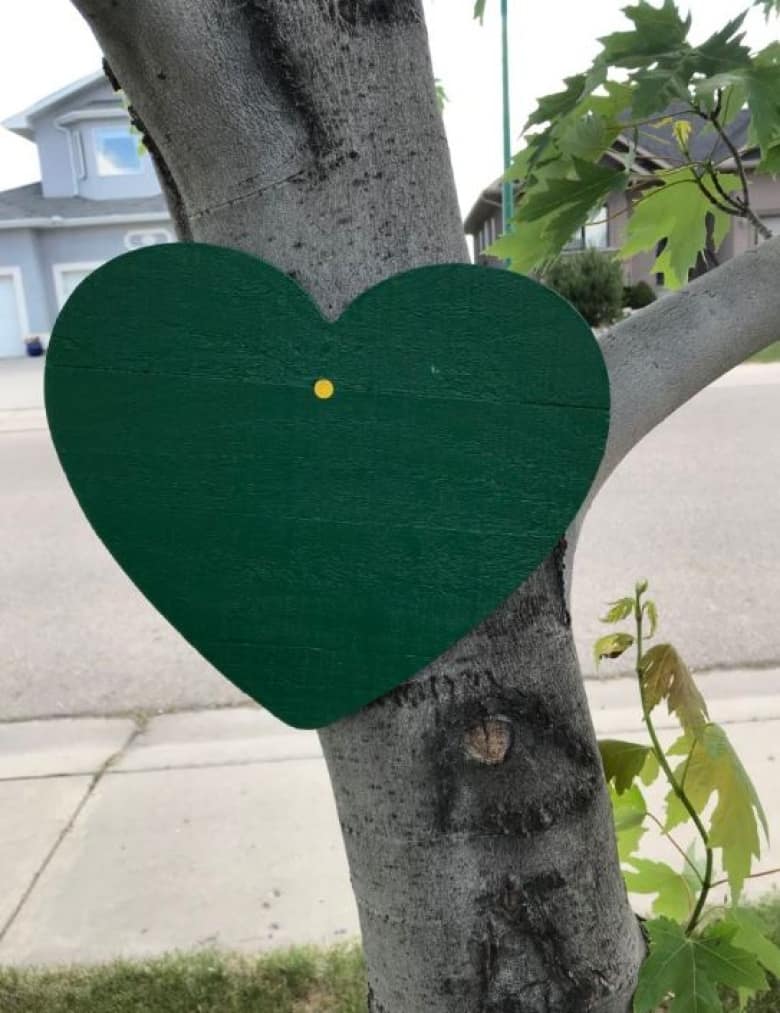 In Larrigan’s hometown, a local charity had put up red hearts on several trees, as a way to raise money for charity, which gave her an idea.