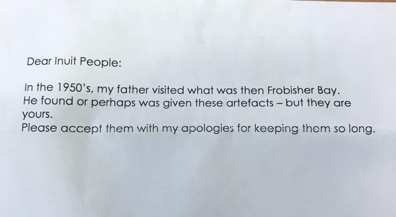 “Dear Inuit people,” the note reads. “In the 1950’s, my father visited what was then Frobisher Bay. He found or perhaps was given these artefacts [sic] — but they are yours. Please accept them with my apologies for keeping them so long.”