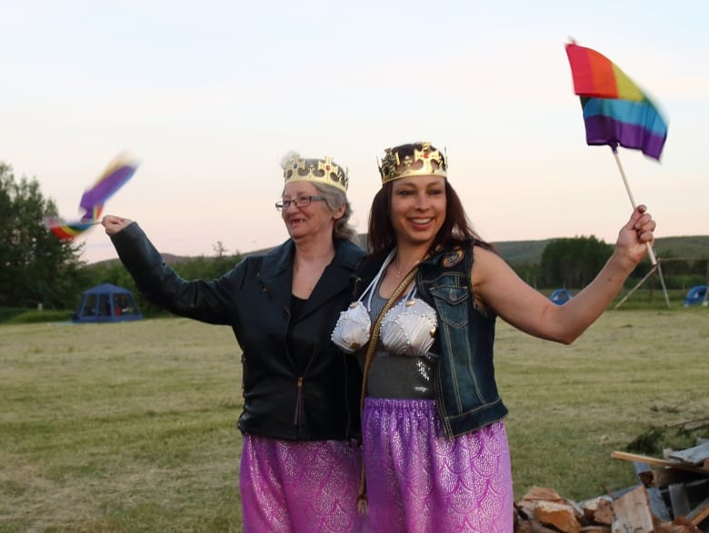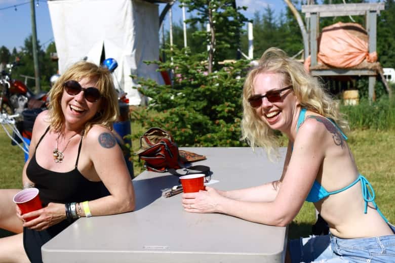 Sheila Kelly and Erica Meus-Saunders pose together on the first night of the festival. Kelly, 56, is a grandmother and great-grandmother who works on the oil fields in Fort Saskatchewan.