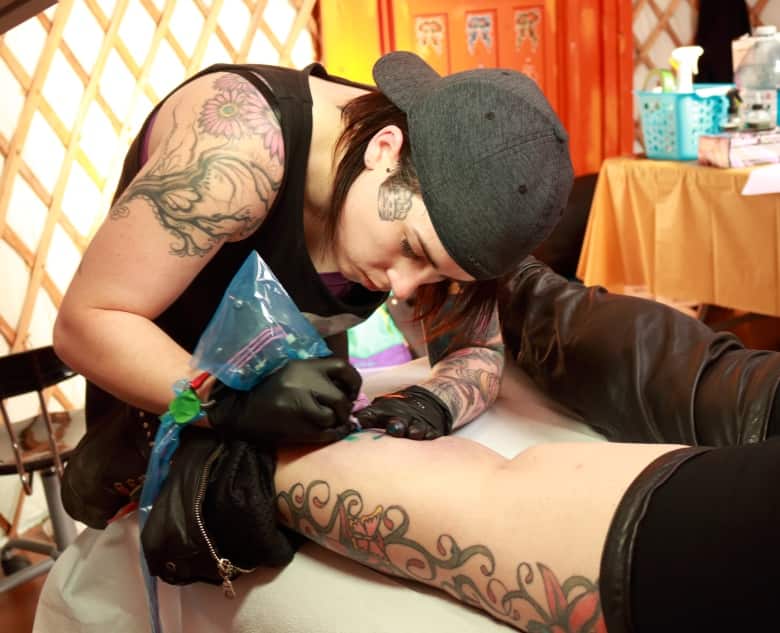 Sayers and fellow artist Jesse-Lynn Jenkins of Oceans of Ink in Sussex set up shop in the Hurt Yurt, a mobile tattoo studio at the edge of the campground.