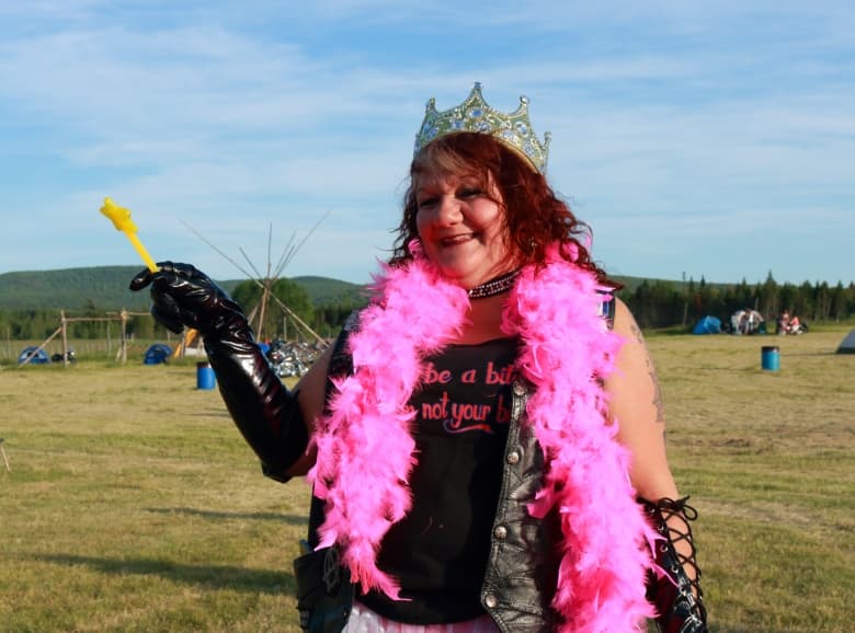 Kentville biker Paulette Rogers of the Road Crew motorcycle club. Rodgers was the belle of the ball in a spectacular pleather ensemble accessorized with lace-up gloves and a pink feather boa.