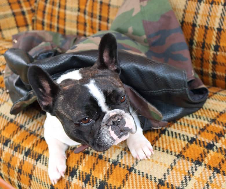 Unofficial festival mascot: Lola, a French bulldog, keeps warm snuggled into a biker vest at Mad Squirrel Leather, one of the vendors.