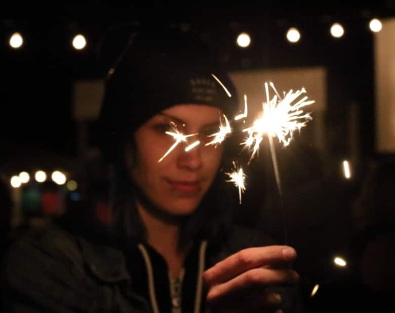 Shine bright like a diamond: Cait Milberry holds a sparkler while waiting for her turn at the karaoke mic.