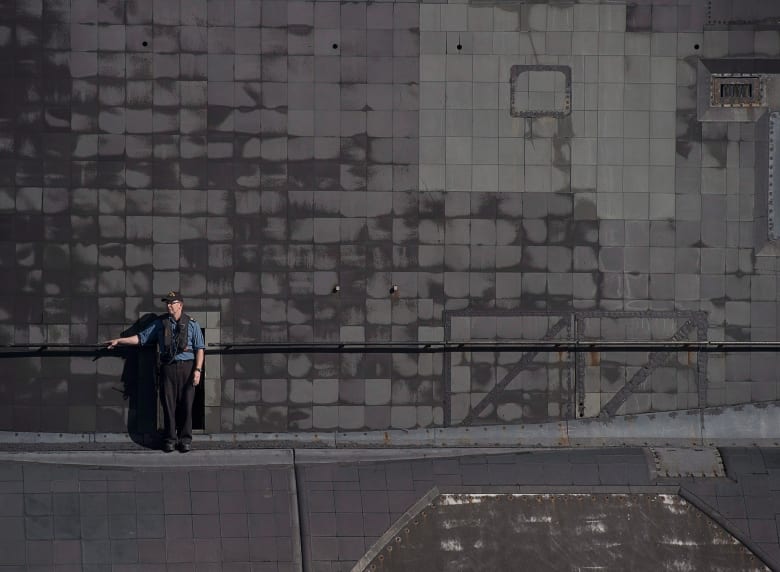 A sailor stands at the base of the conning tower on HMCS Windsor, one of Canada’s Victoria-class long range patrol submarines, as it returns to port in Halifax. (Andrew Vaughan/Canadian Press)