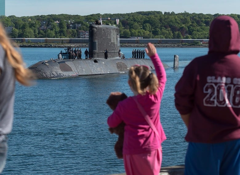 Family and friends greet HMCS Windsor, one of Canada’s Victoria-class long range patrol submarines, as it returns to port in Halifax on Wednesday. (Andrew Vaughan/Canadian Press)