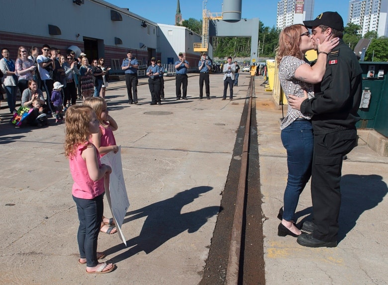 Leading Seaman Ian Jacobson, selected to be the first off the boat, kisses fiancée Jessica Chapman as their children, Abbie and Brailynn, look on. (Andrew Vaughan/Canadian Press)