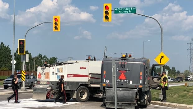 Clean-up crews on scene at Sterling Lyon Parkway Wednesday afternoon. (Travis Golby/CBC)