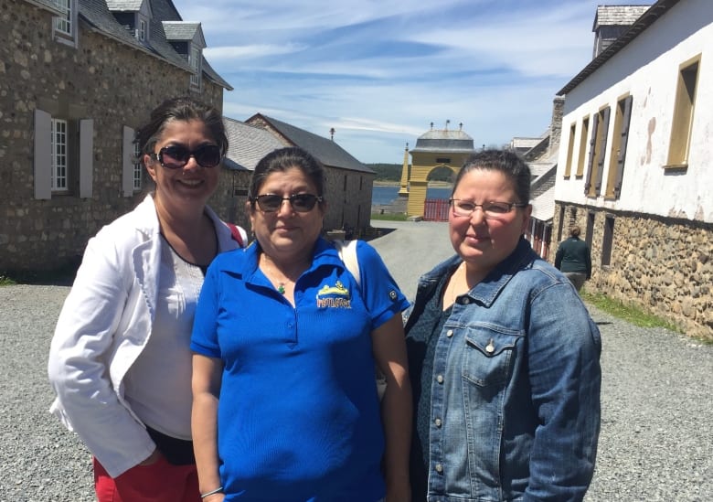 Gwenn Marshall, Denise Doucette and Noelle Doucette of the Potlotek Women’s Sewing Club created the dress, a replica of those worn by Mi’kmaq women in the 18th century. (Yvonne LeBlanc-Smith/CBC)