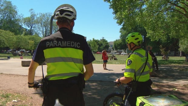 In Vancouver, paramedics on bikes spent Monday in Oppenheimer Park meeting with Downtown Eastside residents and providing outreach due to the heat wave. (Denis Dossman/CBC)