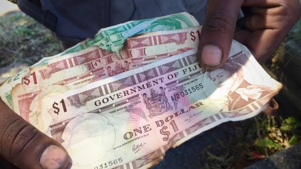 A few minutes later, the man returns to show off three paper bills. They’re $1 and $2 bills from Fiji, dating back decades that he says he found on the properties.