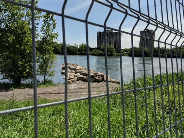 Verdun constructed a stone structure near the planned public beach to slow the current for swimmers, but swimming won’t be allowed until at least next year. (Navneet Pall/CBC )