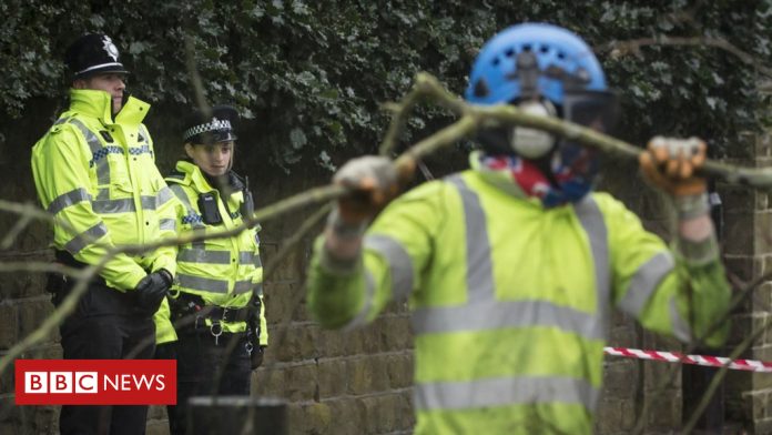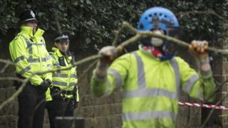 Police look on as contractors cut down a tree in Rustlings Road, SheffieldImage copyright
