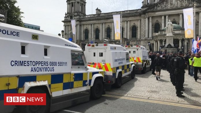 Police in riot gear have been called in to divide two groups of protesters outside Belfast City Hall.