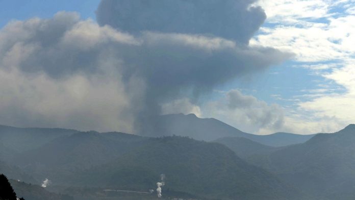 A Japanese volcano that was used as a lair by James Bond’s nemesis has erupted, sending a plume of smoke thousands of metres into the air.