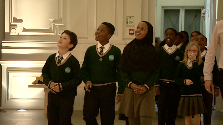 On that invitation, the schoolchildren enter a room and gasp at a skeleton. They are in awe and their reaction is beautiful.